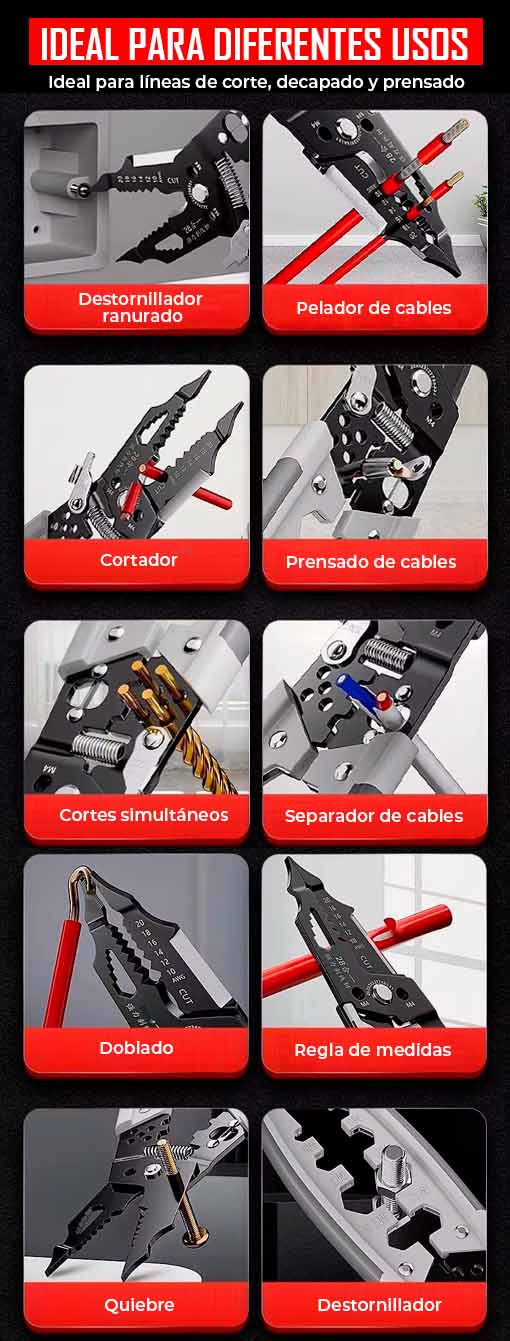 Desde aplicaciones industriales hasta trabajos eléctricos en casa. Este alicate será tu mejor aliado. Pelar, cortar y engarzar terminales nunca ha sido tan fácil y eficiente. Olvídate de cambiar entre múltiples herramientas, ¡todo lo que necesitas está aquí en un solo dispositivo!