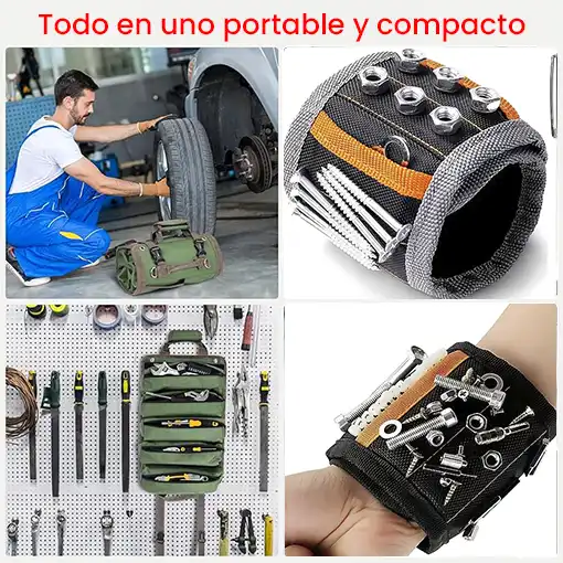 Nuestro maletín enrollable, compacto y resistente y Nuestro brazalete magnético, ergonómico que te ofrece libertad de movimiento mientras mantiene clavos, tornillos y brocas siempre a mano.