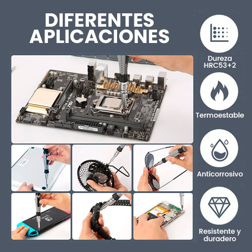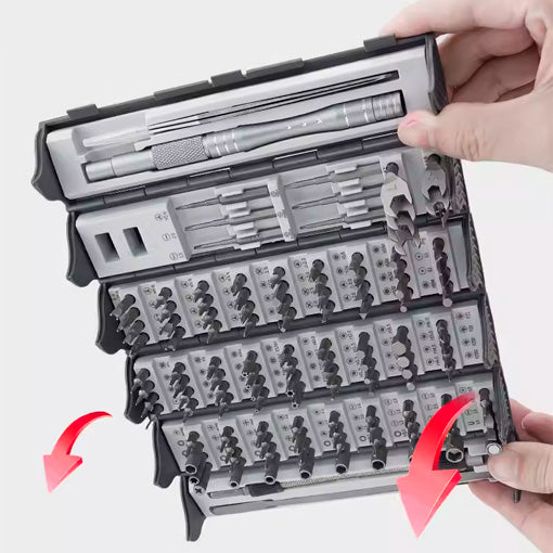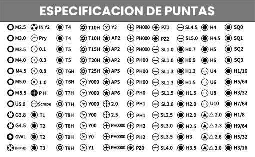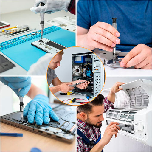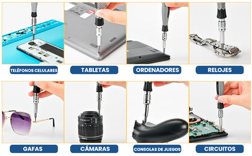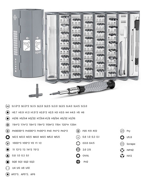 Más de 100 cabezas diferentes, incluidas Phillips, Flathead, Torx, Torx Security, Pentalobe, Triwing y más. Es adecuado reparar computadoras portátiles, ensamblaje de PC, teléfonos, tablets, MacBooks, iPhones, iPads y herramientas de corte.