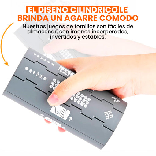 Su diseño de cilindro enrollable permite un fácil transporte, acceso y almacenamiento de las cabezas de los destornilladores y de todos los complementos necesarios que necesitas para llevar a cabo el trabajo.
