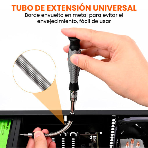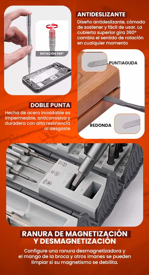 El mango cuenta con un imán fuerte incorporado que transfiere la fuerza magnética a las cabezas del destornillador, lo que facilita recoger tornillos pequeños. Su diseño ergonómico tiene agarre esculpido en 3D y una cola giratoria de 360° para mayor comodidad.
