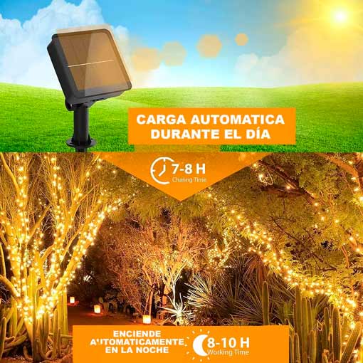 Estas hermosas luces navideñas absorben la luz del sol durante el día para iluminar automáticamente tus exteriores por la noche. Son ideales para decorar tu jardín, patio, garaje, portón, reja, etc.