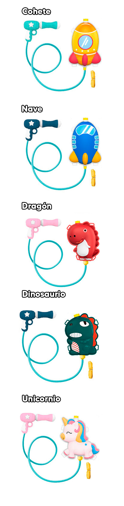 Perfecta para divertirse en un día soleado, jueguen en el patio de la casa, la playa o la piscina, gracias a su sistema de bombeopuede alcanzar una distancia hasta de 8 metrosy contener alrededor de1300 ml de agua en su tanque.