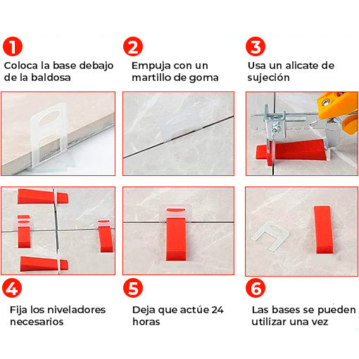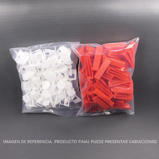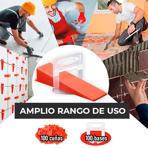 Este kit está diseñado para lograr una nivelación perfecta entre revestimientos, y separaciones parejas entre uniones. El kit está compuesto por CUÑAS NIVELADORAS (reutilizables) yBASES AUTONIVELANTES (no reutilizables)