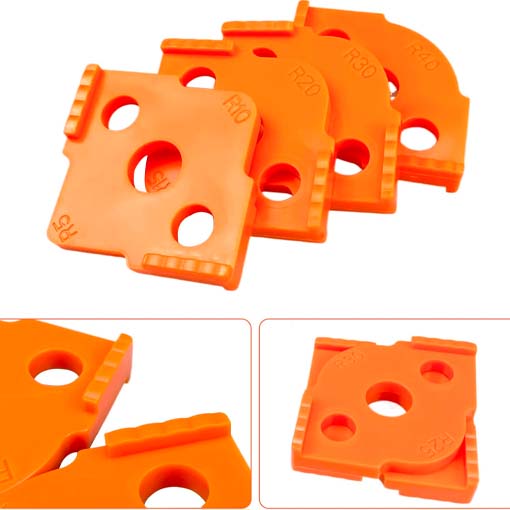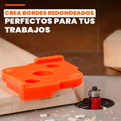 Las guías integradas se ubican de manera segura en la esquina de las piezas de trabajo y solo es necesario sostenerlas en su lugar con la mano mientras se fresa. Cada guía presenta dos radios diferentes con los tamaños claramente grabados con láser en ambos lados para una fácil identificación.